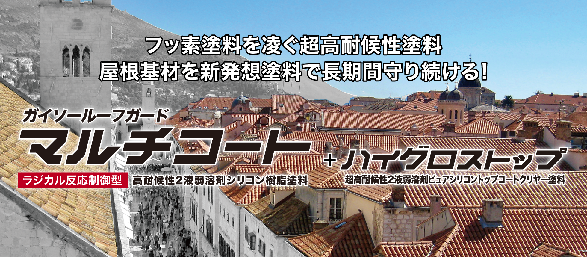 「ガイソールーフガード マルチコート」は高耐候性ラジカル反応制御型2液弱溶剤シリコン樹脂屋根専用塗料です。