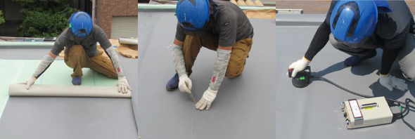 下地に塩化ビニール樹脂の防水シートを接着材などで貼る。シート同士は熱風で溶かして一体化できる。